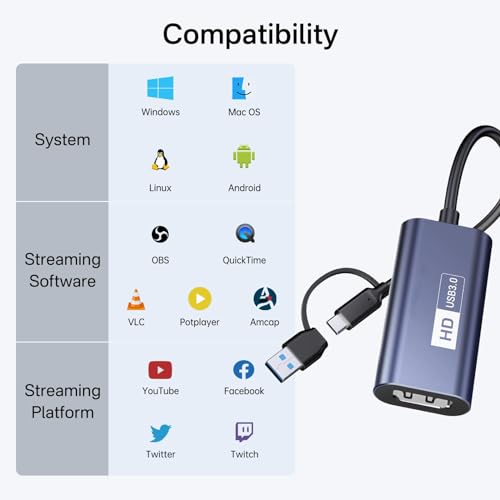 - Broad Compatibility & Application: Utilizes the MS2130 chip for broad compatibility with platforms like OBS, Twitch, and YouTube, and supports various devices including PS5, Xbox, and DSLR cameras, suitable for Windows, Mac OS, Android, and Linux.
